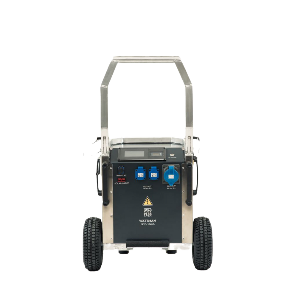 Le Wattman est une solution d'alimentation mobile offrant une puissance continue de 6 000 W, idéale pour alimenter vos équipements électriques sans émissions ni bruits gênants. Silencieuse, robuste et rapide à recharger, elle assure une autonomie prolongée jusqu’à plus de 21 h, tout en restant compacte et facile à déplacer.